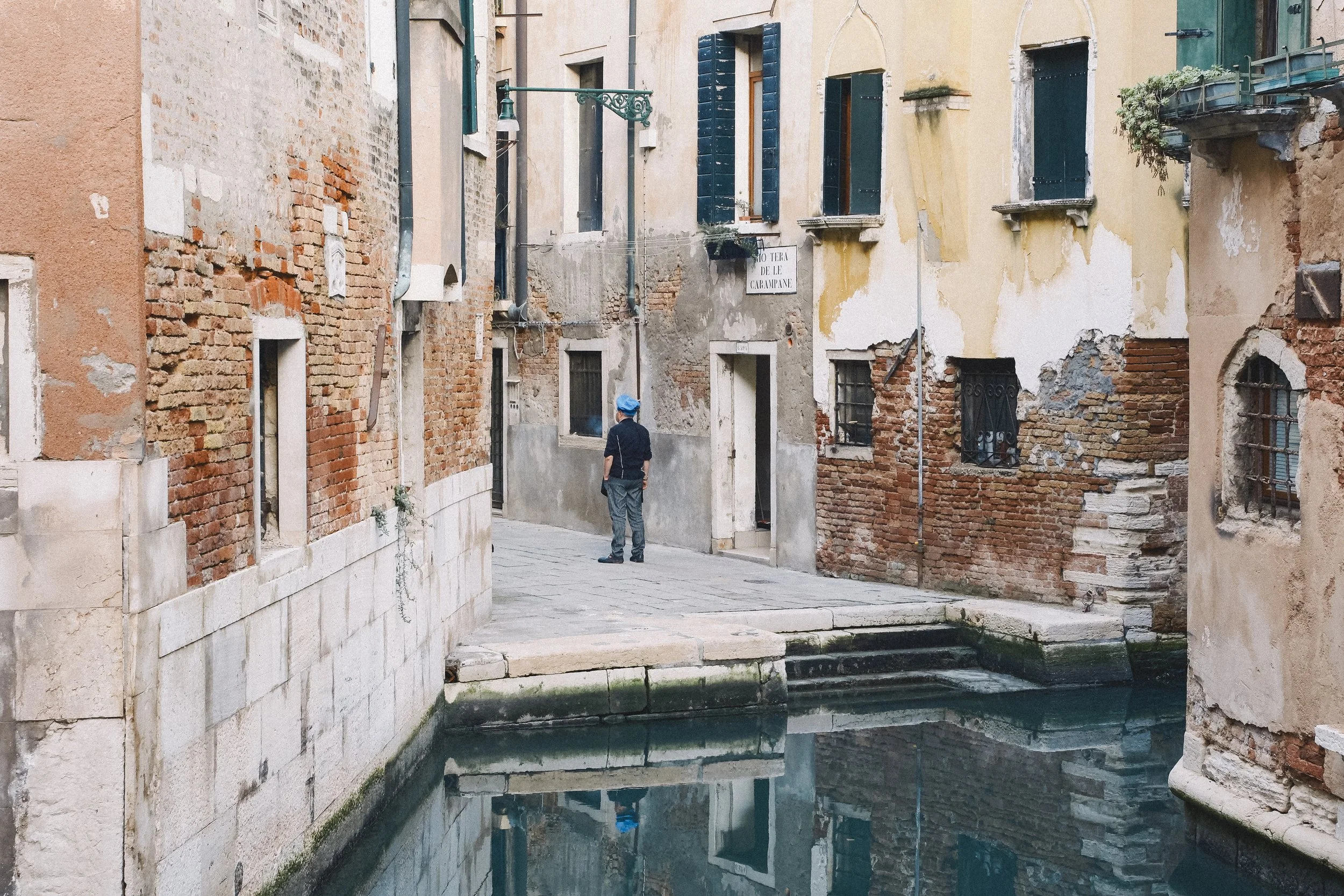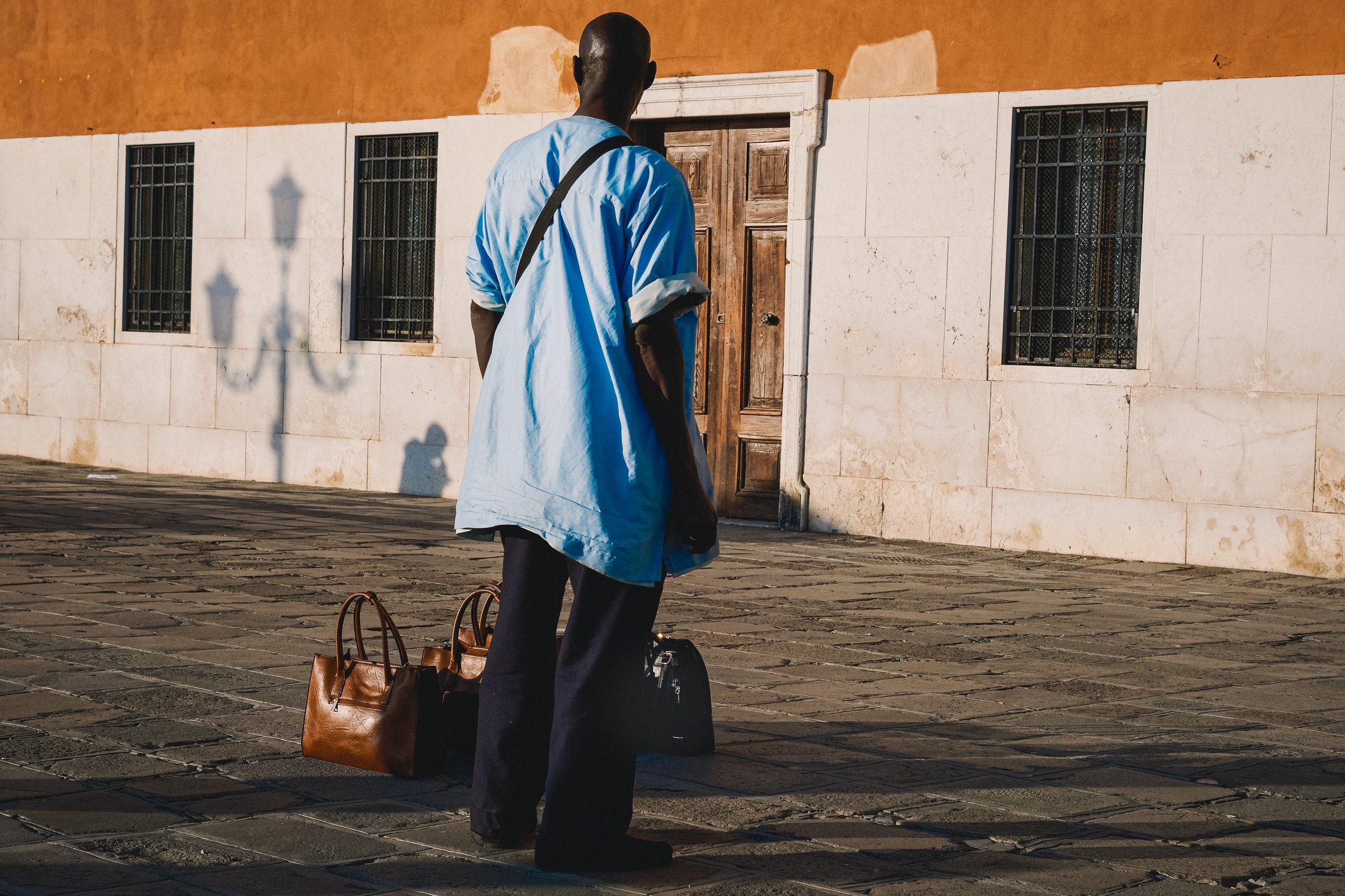 A man sitting on a small bench outside a building, looking at his phone, with a large wooden door behind him and sunlight casting shadows on the brick wall.